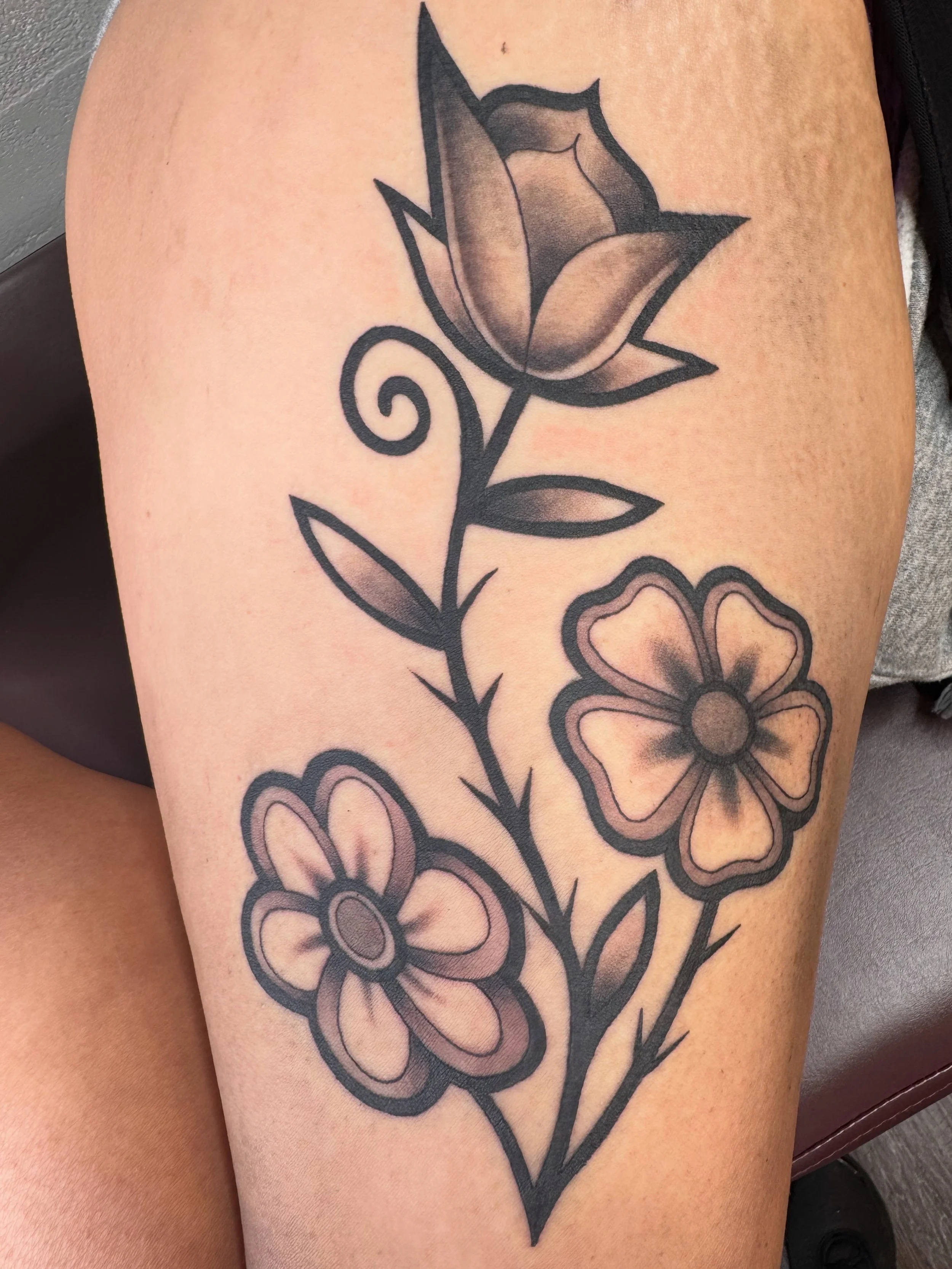 Black and gray tattoos are a sometimes a little quicker and cheaper option! sometimes in my opinion a better option. Depending on what you want will effect how much more time it will take ! For example a realistic tattoo can take up to 3x longer than something semi realistic. I enjoy black and gray just as much as color !